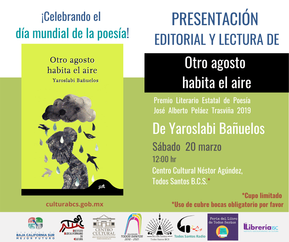 Con el propósito de poner al alcance de la población nuevas publicaciones editoriales, el Gobierno del Estado y el Instituto Sudcaliforniano de Cultura llevarán a cabo el próximo sábado 20 de marzo a las 12:00 horas en el pueblo mágico de Todos Santos la presentación y lectura del poemario “Otro Agosto Habita en el Aire”, de Yaroslavi Bañuelos, ganadora del premio literario estatal de poesía “José Alberto Peláez Trasviña” 2019.