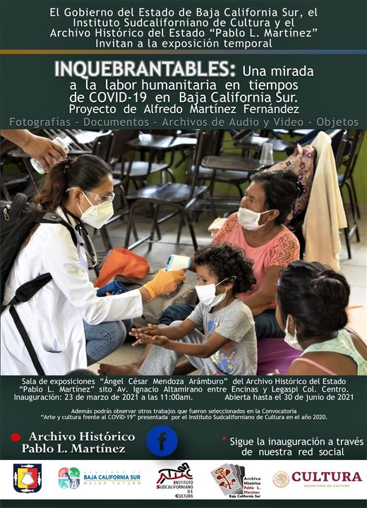 El Gobierno del Estado, el Instituto Sudcaliforniano de Cultura (ISC), a través del Archivo Histórico Pablo L. Martínez (AHPLM) llevaran a cabo de manera virtual la inauguración de la exposición fotográfica Inquebrantables; Una mirada a la labor humanitaria en tiempos de COVID-19 en Baja California Sur, de Alfredo Martínez Fernández, informó Luis Domínguez Bareño Director del Archivo.