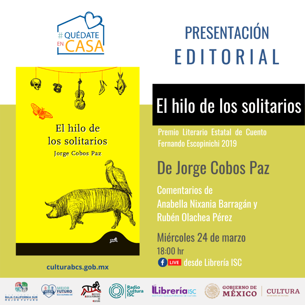 El Gobierno del Estado, el Instituto Sudcaliforniano de Cultura (ISC), a través de la Coordinación de Fomento Editorial, llevarán a cabo la presentación editorial del libro “El Hilo de los Solitarios”, de Jorge Cobos Paz, ganador del premio literario estatal “Fernando Escopinichi 2019”, mencionó América Pineda García Coordinadora de Fomento Editorial.
