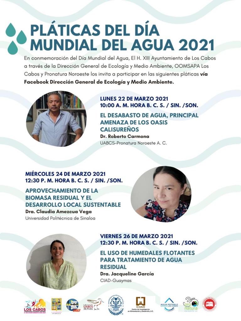 Por último, la tercera plática la impartirá el 26 de marzo a las 12:30 de tarde quien está a cargo del Laboratorio de Ciencias Ambientales del Centro de Investigación en Alimentación y Desarrollo (CIAD) de Guaymas Sonora, la Dra. Jaqueline García, y el tema será “El uso de los Humedales Flotantes para tratamiento de agua residual”.