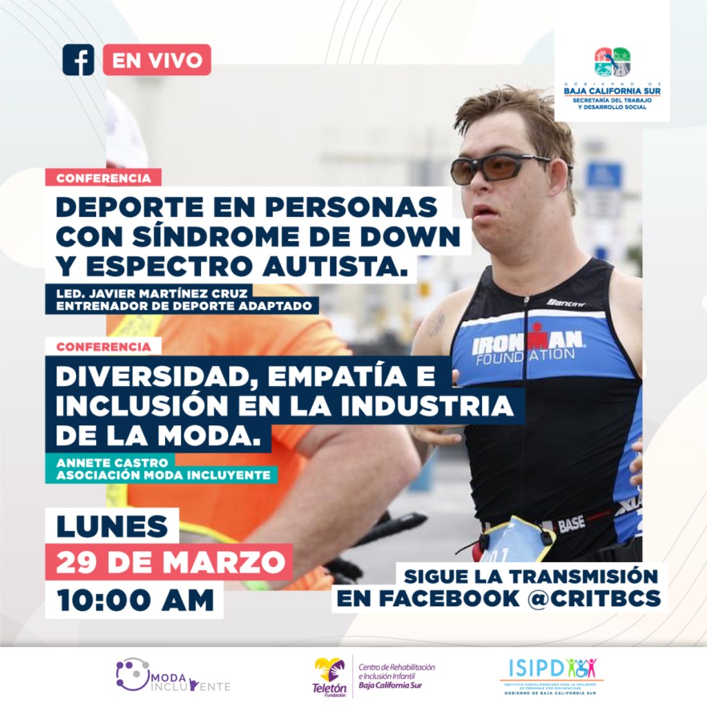 De esta forma la directora anuncio que el lunes 29 de marzo a través de las redes sociales de Facebook del CRIT Baja California Sur, en conjunto con las del ISIPD a través de la página de la STDS, se expondrán las conferencias en temas como: “Deporte en Personas con Síndrome de Down y Espectro Autista” a cargo de Javier Martínez Cruz, entrenador de deporte adaptado y “Diversidad, Empatía e Inclusión en la Industria de la Moda” a cargo de Annette Castro quien forma parte de la empresa moda incluyente.