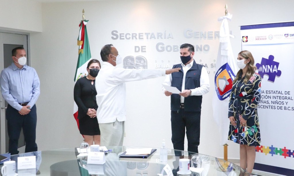 En el marco de la sesión extraordinaria del Sistema Estatal de Protección Integral de Niñas, Niños y Adolescentes (SIPINNA), el secretario General de Gobierno, Álvaro De la Peña Angulo, entregó nombramiento y tomó protesta de ley, al nuevo titular de esta Secretaría Ejecutiva, profesor Cuauhtémoc Estrada Meza, quien continuará realizando las actividades de forma coordinada, con las dependencias de los tres órdenes de gobierno que integran este Sistema en Baja California Sur.
