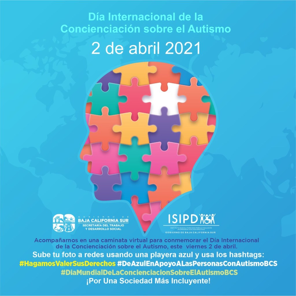 Con el propósito de conmemorar el Dia Mundial de Concienciación sobre el Autismo el próximo viernes 02 de abril, el Instituto Sudcaliforniano para la Inclusión de las Personas con Discapacidad (ISIPD), está convocando a una caminata virtual y con ello invitar a la ciudadanía a compartir en redes sociales fotos vistiendo playeras o prensas azules y mostrando leyendas alusivas a esta fecha, informó Yazmith Bataz Carballo, titular de esta dependencia estatal