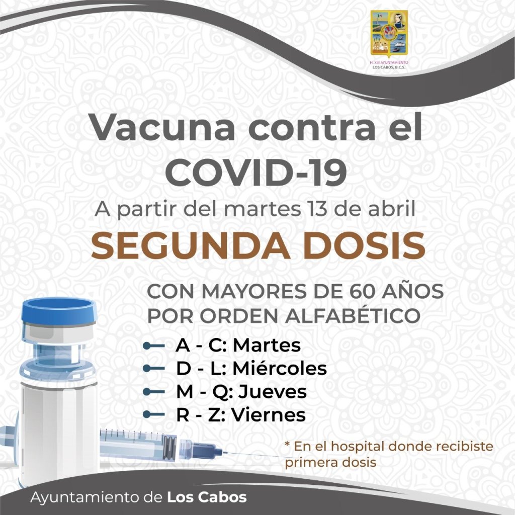 Será a partir de este martes 13 de abril del año en curso cuando inicien con la aplicación de vacunas en el municipio de Los Cabos, de acuerdo a la letra de su primer apellido. A los adultos mayores con apellidos de la A a la C, serán vacunados el martes 13 de abril; de la D a la L, el miércoles 14 de abril; de la M a la Q, el jueves 15 de abril, y de la R a la Z, el viernes 16 de abril.