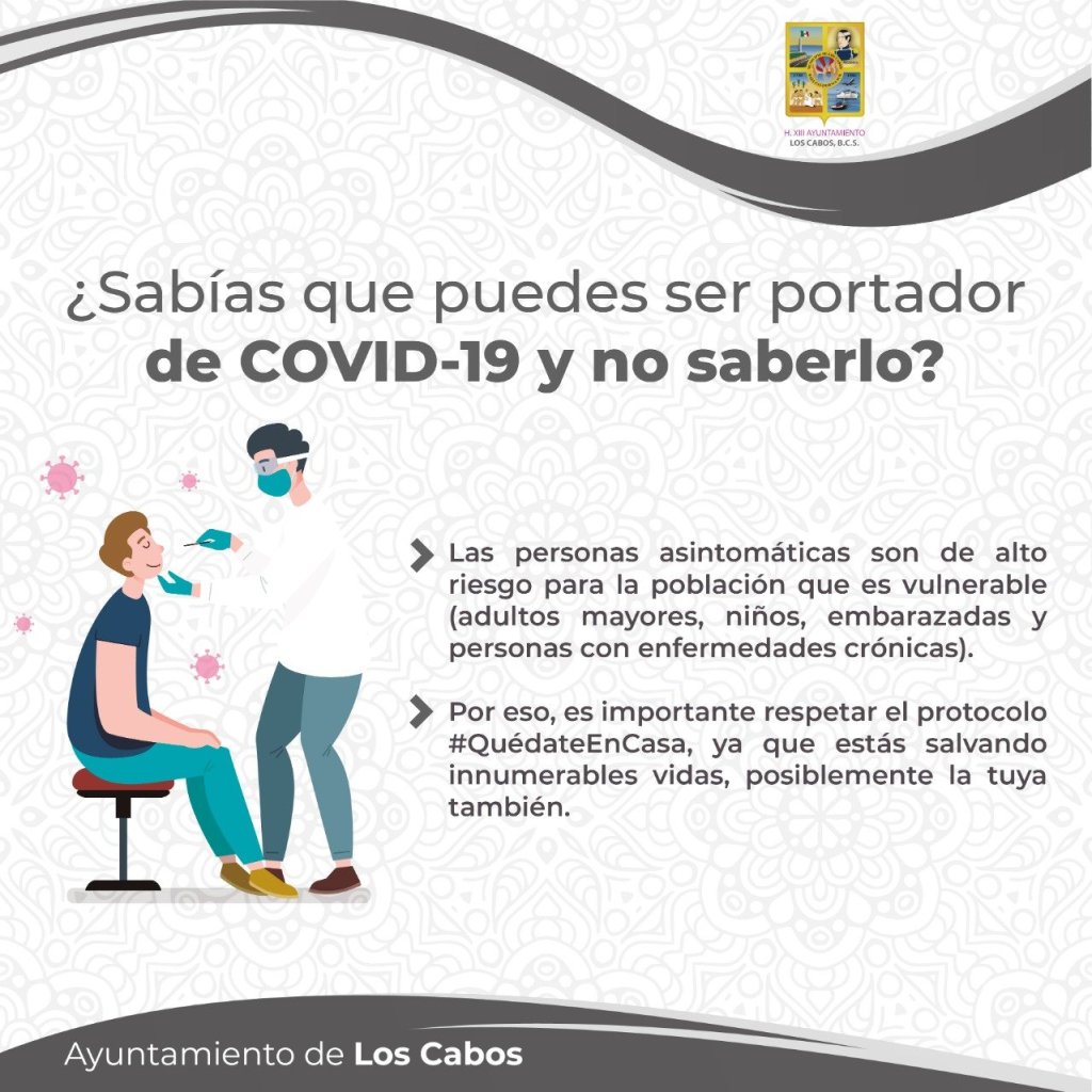 Los Cabos, BCS. La gran proporción de personas que son portadoras del SARS-CoV-2 pero no lo saben, porque no se han sentido mal, es uno de los vectores principales de la propagación y de alto riesgo para la población vulnerable (niños, adultos mayores, embarazadas y personas con enfermedades crónicas).
