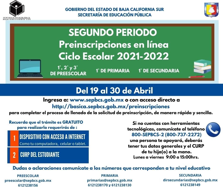 A partir de este lunes 19 de abril, la Secretaría de Educación Pública de Baja California Sur inicia el segundo periodo de preinscripciones en línea para ingreso a preescolar, primer grado de primaria y primer grado de secundaria en el próximo ciclo escolar 2021-2022, informó el titular del sector educativo en la entidad, Gustavo Rodolfo Cruz Chávez.