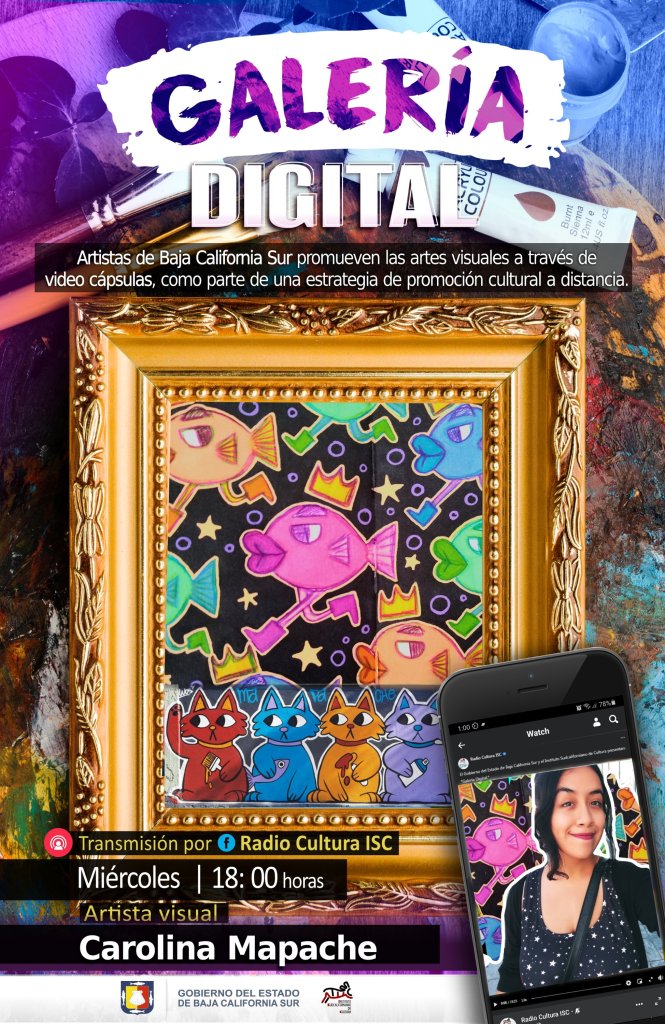 El Instituto Sudcaliforniano de Cultura (ISC), informó que a través del programa Galería Digital, se presentarán detalles importantes acerca de la obra y trayectoria de la artista visual Carolina Mapache, en ello se podrán observar diversas piezas de arte.